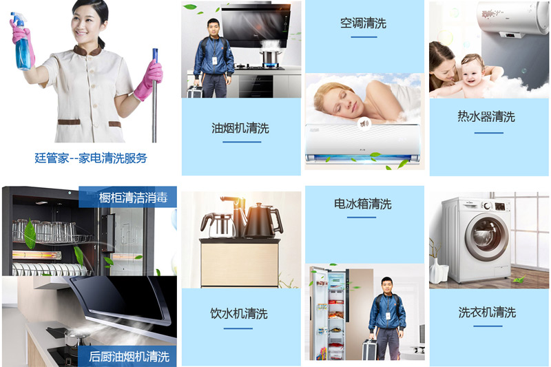 廷管家服務項目包含油煙機清洗、空調(diào)清洗、熱水器清洗、飲水機清洗等多項家電清洗業(yè)務,安全便捷又放心!
